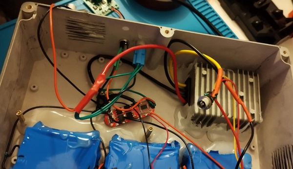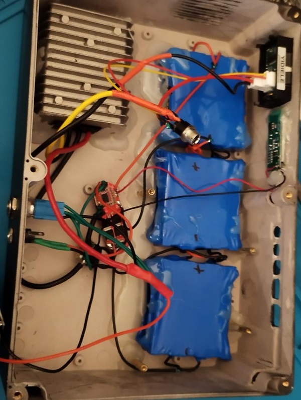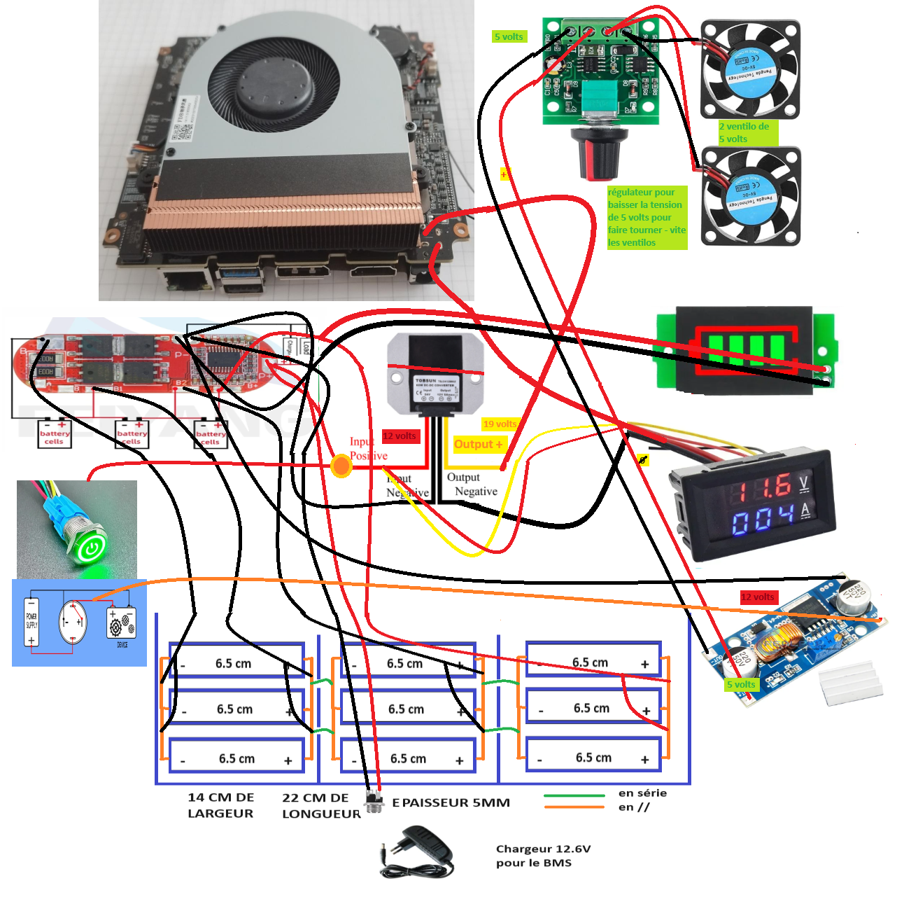 | | Présentation: Version 1 3S3P 12.6v avec step up 19v: 9 piles 12000mAh pour une consommation de 1 à 1.5A par // Version 2 6S5P 25.2v avec step down 18.6v: 30 piles 8000mAh+9000mAh 17000mAh pour une consommation de 0.5 à 0.6A par //