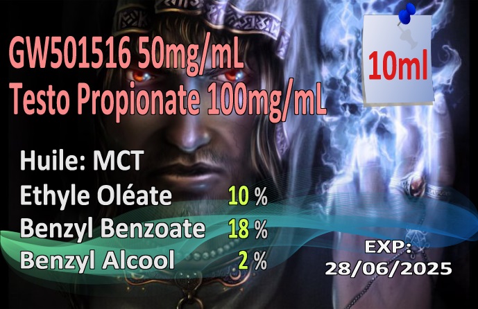 Préparation: Produit fini: fiole de 10ml 1007mg raw TestoP (Mp: 123°C) 502mg raw GW (Mp: 136°C) MCT: 5.7ml BA: 0.2ml BB: 1.8ml EO: 1.0ml