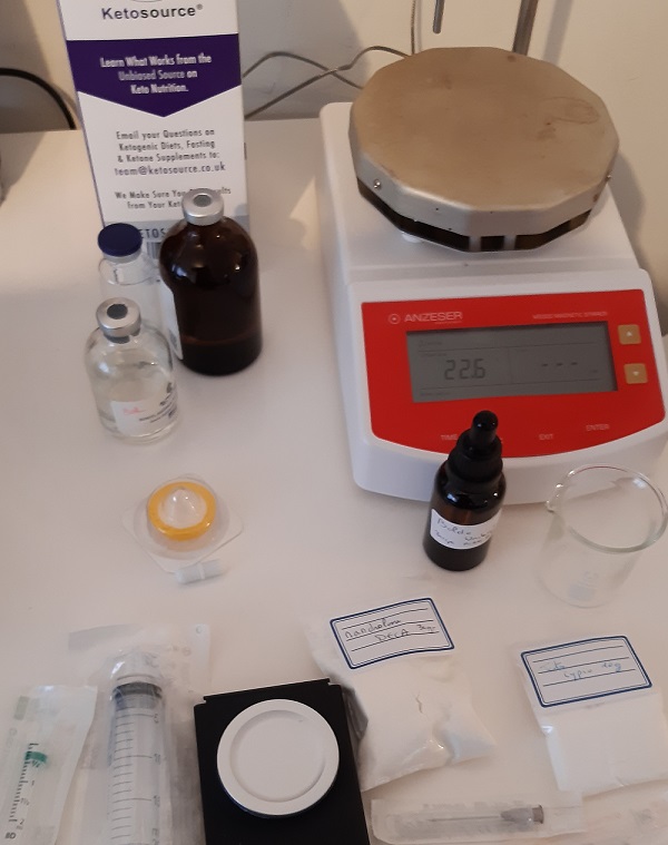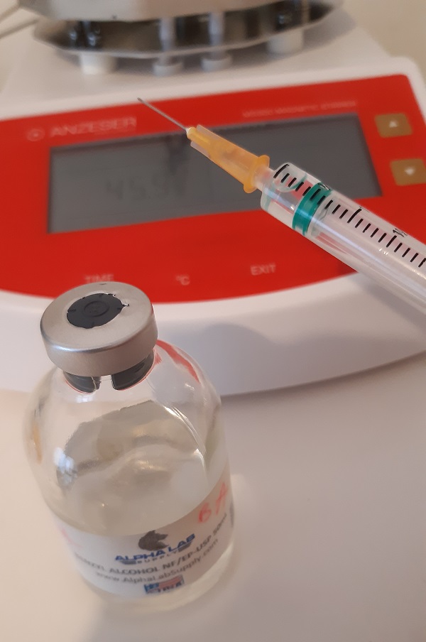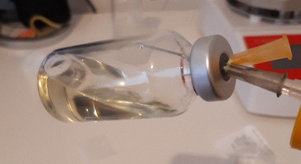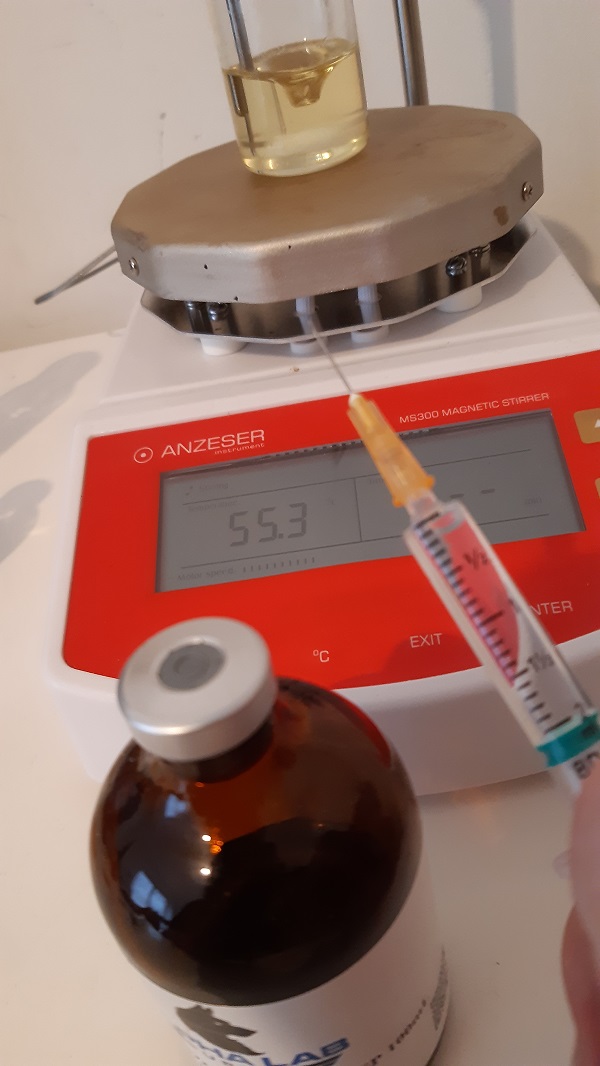 Etape 5: on met à chauffer et en mélange en ayant rajouté l'huile mct sur 13.8ml via 2 seringues: une sur 20ml où je remplis sur 10ml et une sur 2ml que je remplis 2 fois pour faire 3.8ml