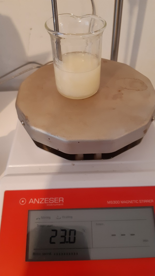 Etape 7: même à 60°C il reste encore de ci de là de la poudre en suspension, toujours laisser en chauffe et en mélange ! Si vous mettez a filtrer maintenant, le filtre va retenir la raw en suspension donc moins de grammage aas dans le produit fini