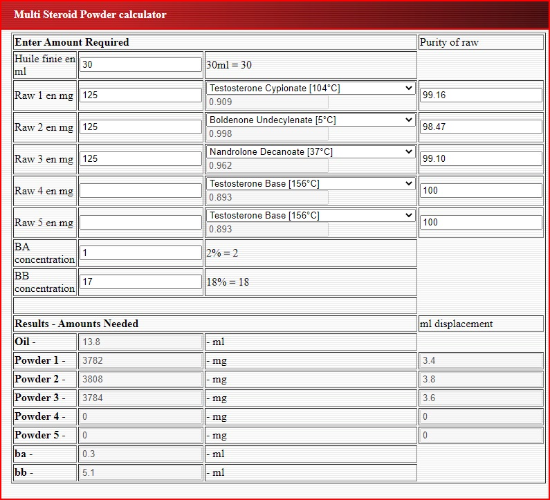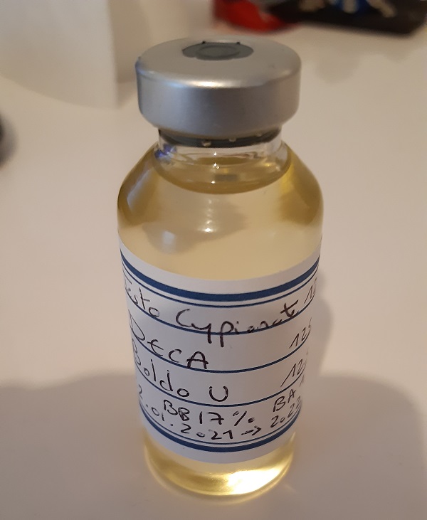 13.8ml MCT 0.3ml ba 5.1ml bb 3782mg Testo C -> 3.4ml 3808mg Boldo U -> 3.8ml 3784mg Deca -> 3.6ml