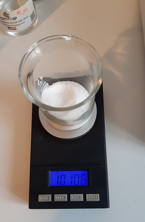 Pour neutraliser la force alcaline de la solution j'ai donc rajouté de l'acidité et pour moi y-a rien de mieux que le NAC à savoir N-Acétyl L-Cystéine. Le NAC est un précurseur du Glutathion, un puissant anti-oxydant. Comme c'est un acide aminé très acide il faut en mettre très peu, j'en ai donc mis 3 fois 15mg soit 45mg pour 20ml de produit fini. Pour avoir exactement ~15mg j'ai utilisé une cuillère dosette orange amazon et elle fait entre 14 et 16mg max à rase avec le NAC. Je rappelle que nos balances électroniques bon marché ne nous permettent pas d'être précis sur une valeur qui commence à 0mg. Elle commence à lire a peu près vers 15-20mg et ensuite elle est précise au milligramme près on va dire hein :p => donc on prélève à rase 5 cuillères comme ça la balance électronique sait lire le poids et ensuite on le divise par 5 et on a donc la moyenne pour 1 seule cuillère de manière précise.