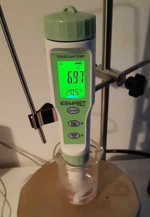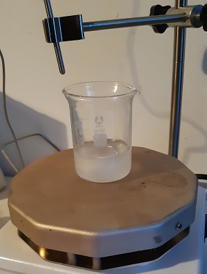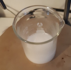 Etape 2: on ajoute l'eau distillée et on met en mélange, il faut un bon 7mn pour que le mélange opaque devienne clair