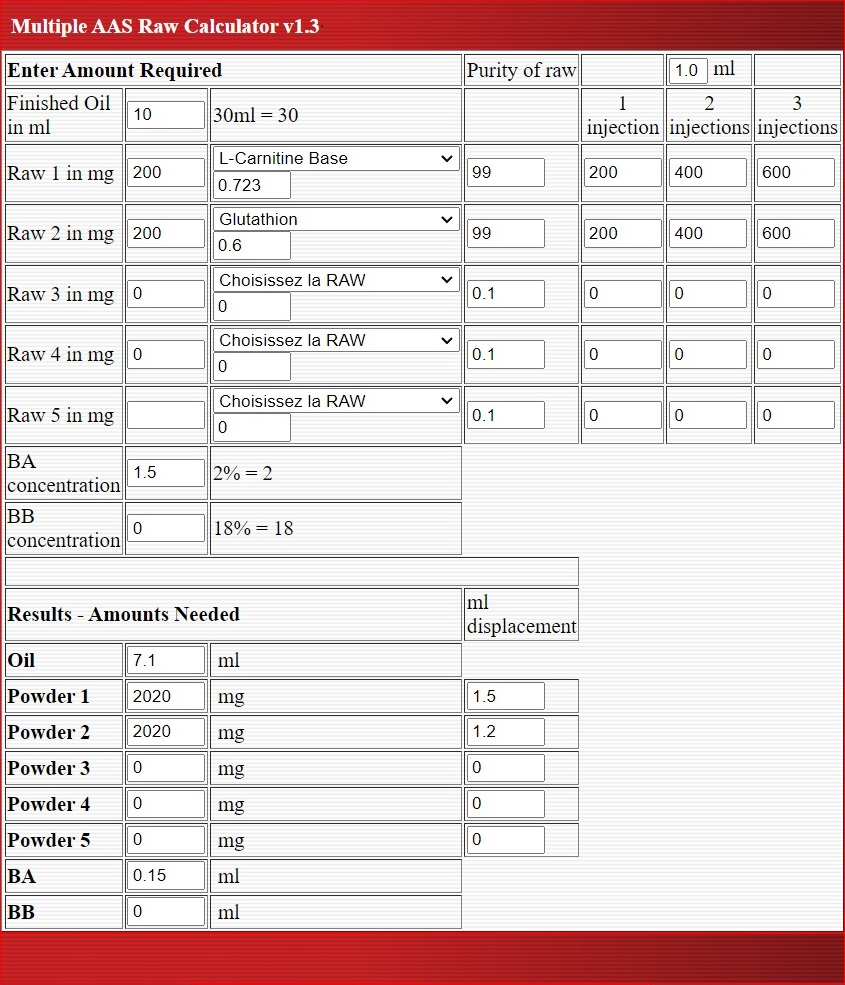 La recette: Pour un produit fini de 10ml BA 1.5%: 0.15mL B2S: 660mg Eau distillée: 7.1 mL L-Carnitine Base: 2020mg Glutathion: 2020mg
