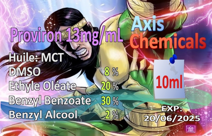 Ingrédients: Mct: 3.9ml Eo: 2.0ml Ba: 0.2ml Bb: 3.0ml Dmso Pharma: 0.8ml Raw Proviron: 130mg (MP: 208°C)