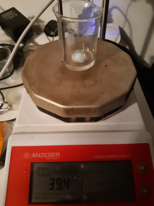 Préparation: Faire chauffer sur le mélangeur/chauffeur la Testo Base et 0.5ml de MCT (pour faciliter le MP et le rendre moins 'crashable' lors de la descente en température). Lors du MP stopper la chauffe et laisser en mélange en ajoutant d'abord les 1.5ml de BB, Puis vers 80°C rajouter les 0.2ml de DMSO , vers les 50°C les 0.2ml de BA et vers 45°C on met les 0.2ml de EL