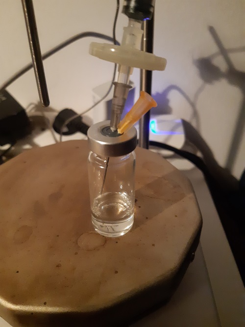 On insère le filtre et on filtre dans une fiole stérile vide