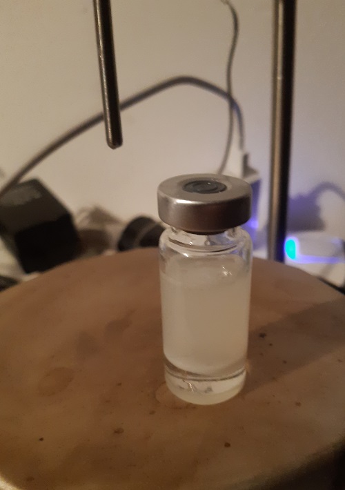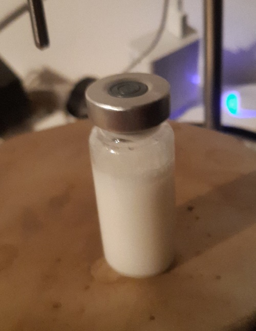 Pour rendre la suspension moins douloureuse j'utilise de l'Ethyl Lactate qui est un anti inflammatoire et un anti bactérien pour éviter la formation d'un abcès. J'ai également diminué la concentration de l'hormone et du dmso. 8% de dmso c'est bcp trop quand on pense que la version vétérinaire utilise au max 5% Ici 2% suffise pour 75mg/ml mais a mon avis serait un peu short pour une version 100mg/ml