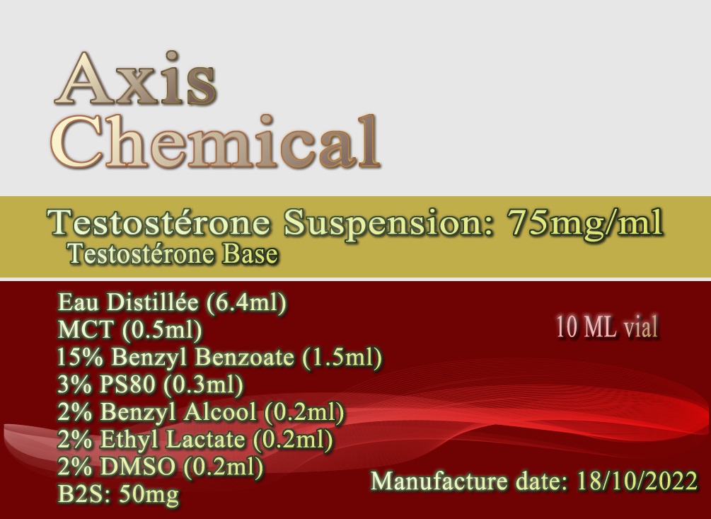 Avant propos: Nouvelle version Testostérone suspension 75mg/ml avec moins de solvants. La version est nettement moins douloureuse cependant il est impossible de spoter sur le lieu d'injection pendant 3 jours. Le lendemain la zone est douloureuse mais sans excès et sans fièvre. Le surlendemain tout est réglé , n'est plus douloureux et la légère enflure est quasi partie mais empêche encore toute injection sur la zone. La Testo suspension créait une légère inflammation sur la zone pour augmenter l'anabolisme sur la zone et permet de combler un retard. Personnellement je l'utilise sur l'arrière d'épaule mais je compte terminer la fiole et ne plus en refaire car je ne suis pas fan et préfère la version non suspension dans l'eau pour la version TNE Testo en MP dans l'huile qui est moins concentré, fourni un meilleur boost et y-a pas cette inflammation.